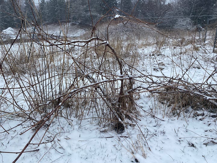 So I dig out the snippers and go to work. I grab the wild vines and wrestle them out of the grass. I sit on the cold ground and clear away long hay and weeds to see the base of the plant. I cut off a lot of growth, leaving it basically bare, but refreshed. They deserve a fresh start, a chance to grow back stronger — and in the right direction this time.
